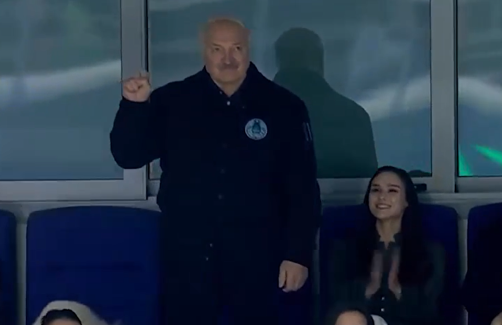 Вместе с ним на трибуне бывший глава Федерации хоккея Беларуси Дмитрий Басков и шпиц Умка.